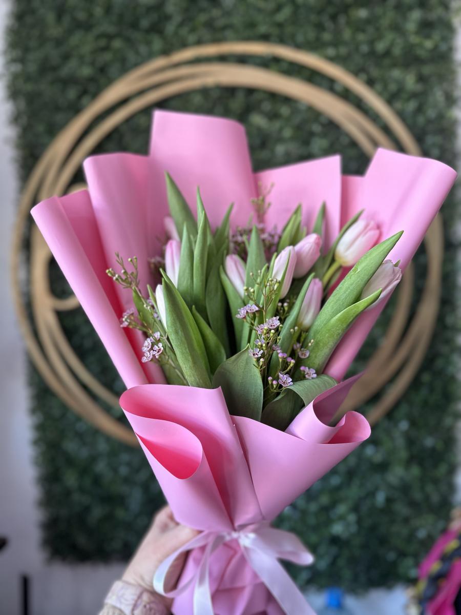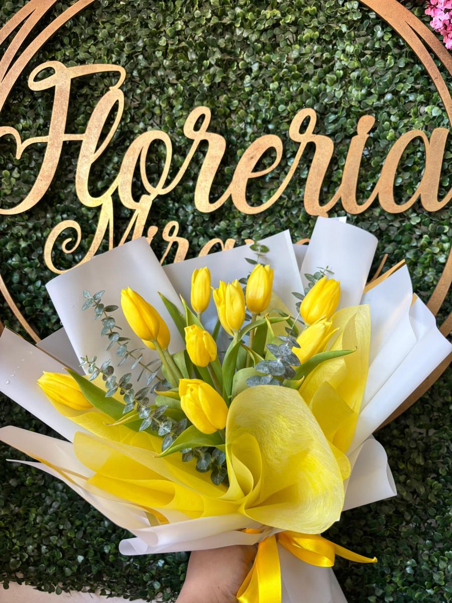 Ramo con 10 tulipanes en color rojo, rosa o naranja (A elegir).