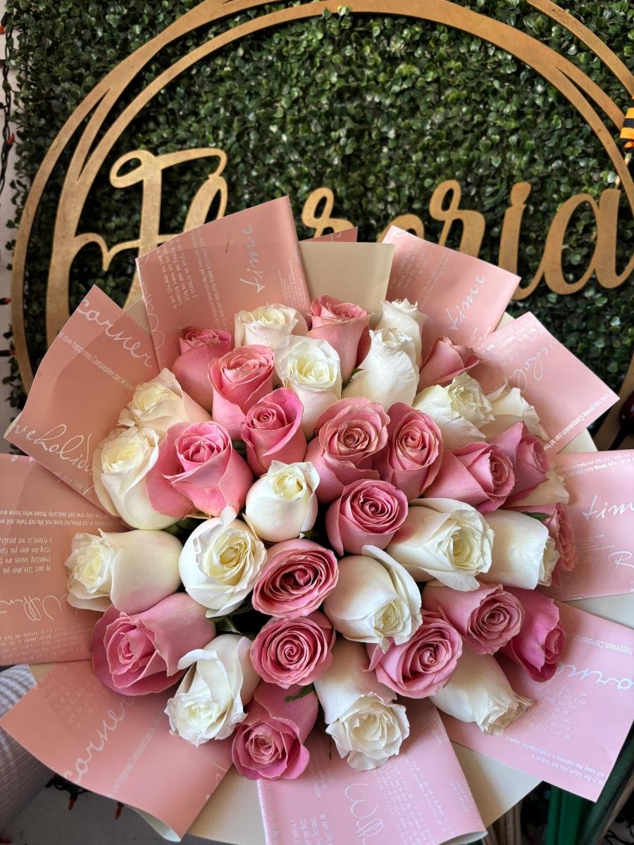 Ramo con 36 rosas rojas, blancas, fucsia, rosa hermosa, rosa pastel o combinadas (A elegir), con listón, envueltas en papel kraft, papel color negro, papel coreano color negro, blanco, rosa o durazno (Especificar en indicaciones del pedido antes de finalizar compra).