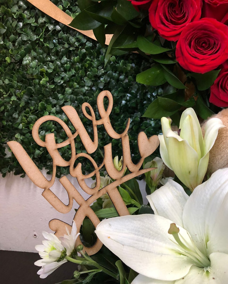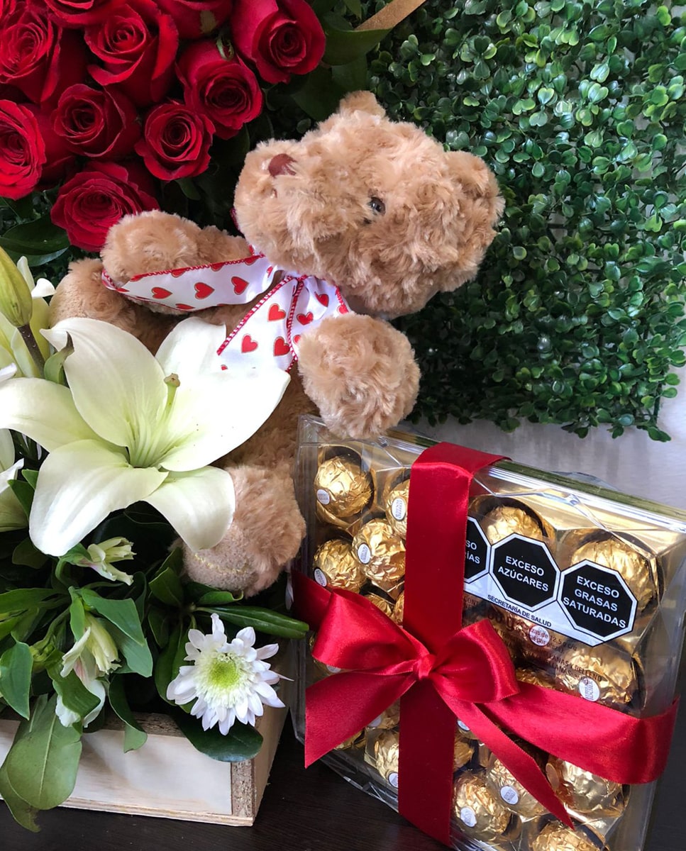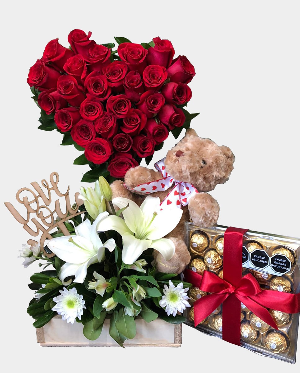 Arreglo en forma de corazón con 28 rosas rojas en la parte de superior con lilis y follajes en la base con caja de Ferreros Roche de 24 piezas, letrero de madera Love You y osito de peluche.
