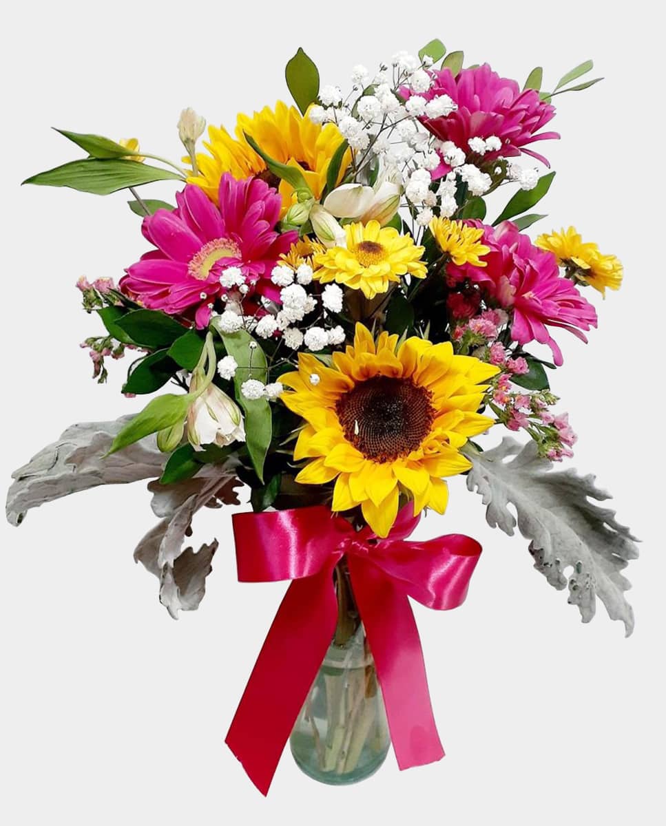 Arreglo floral con 2 girasoles, 3 gerberas, astromelias y follajes finos en jarrón de cristal con listón de organza.