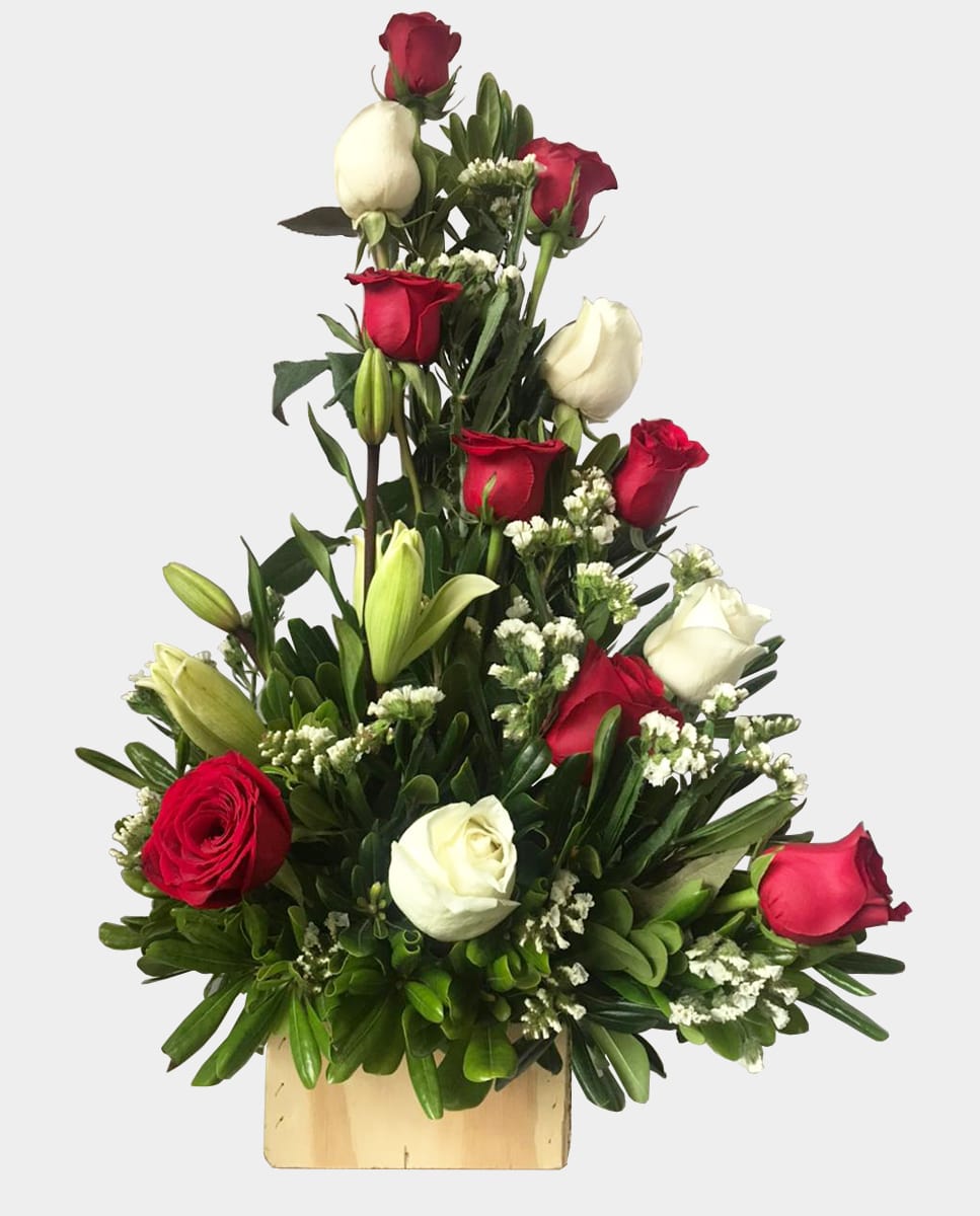 Arreglo floral con 12 rosas, 1 lili y follajes finos en base de madera.