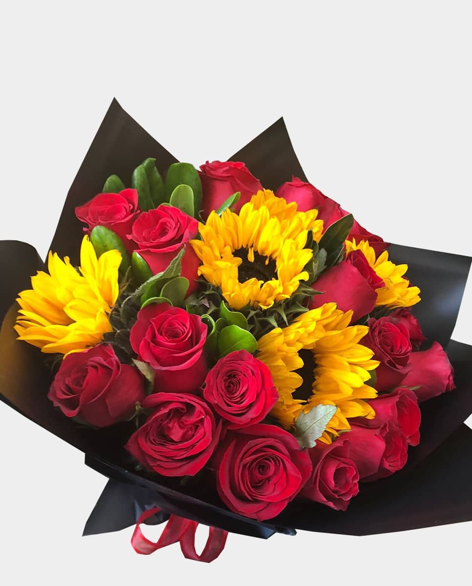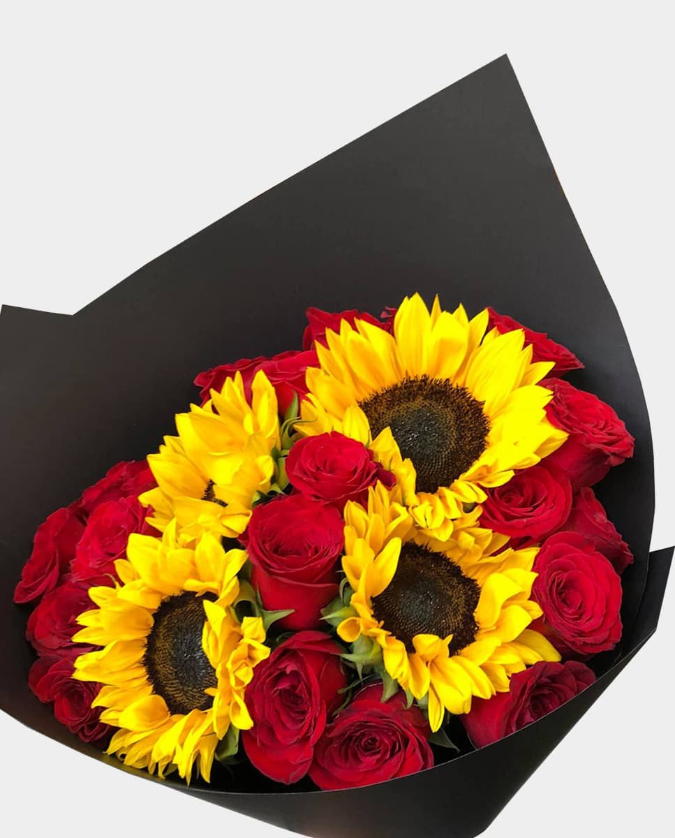 Ramo con 20 rosas y 5 girasoles en papel coreano color negro.