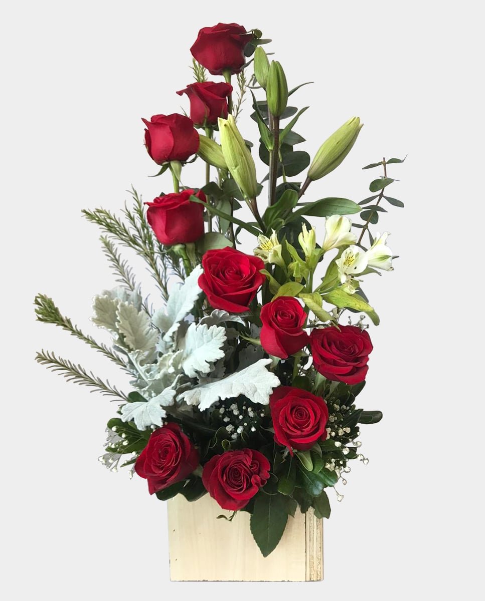 Arreglo floral con 10 rosas, 1 lili y follajes finos en base de madera.