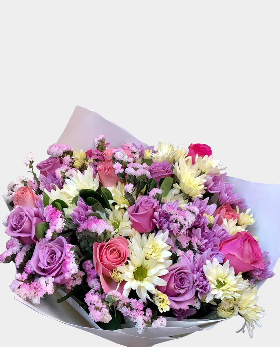 Ramo con 15 rosas tonos pasteles con margaritas y follaje de temporada.