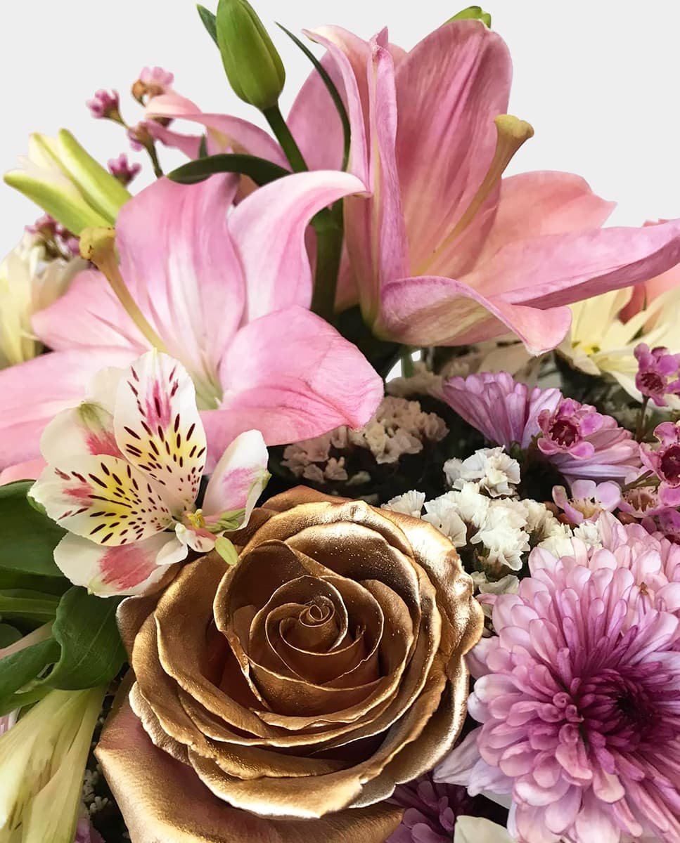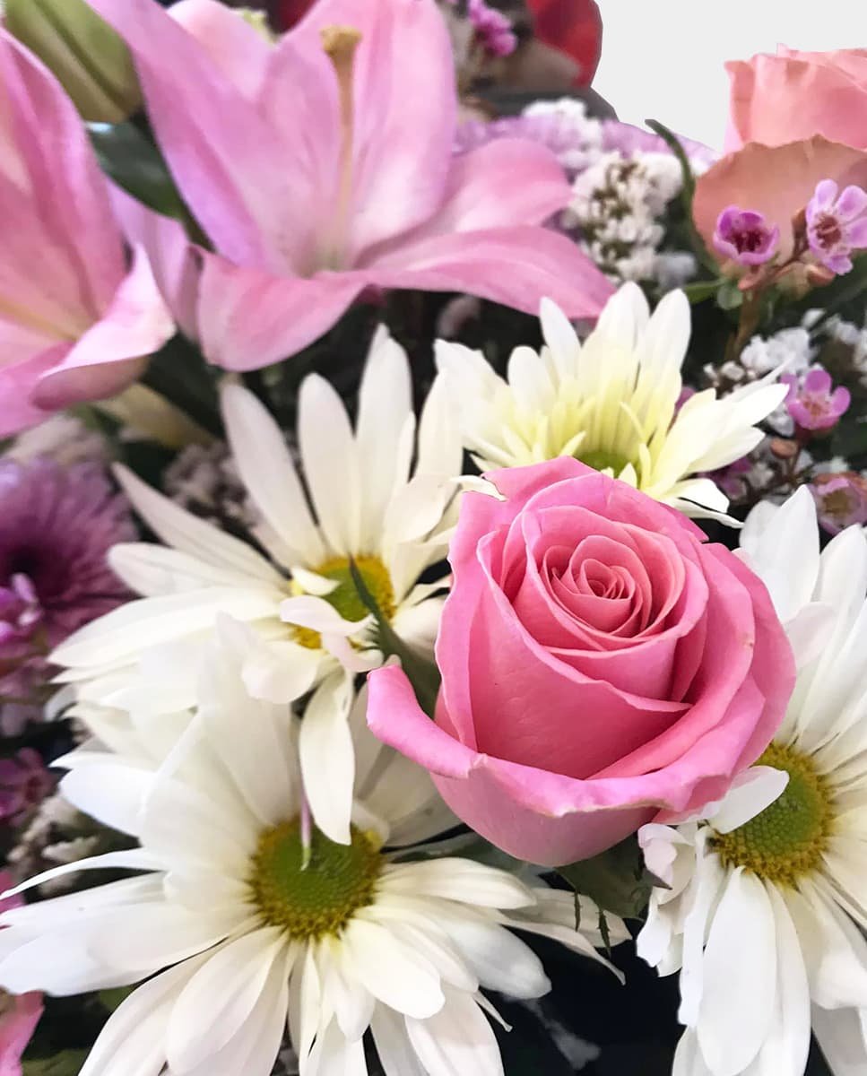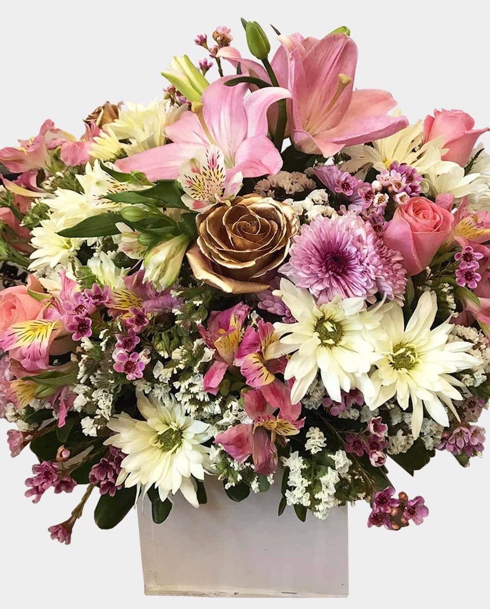 Caja de madera cuadrada con rosas tonos pastel, lilis, flores combinadas con follaje y astromelias.