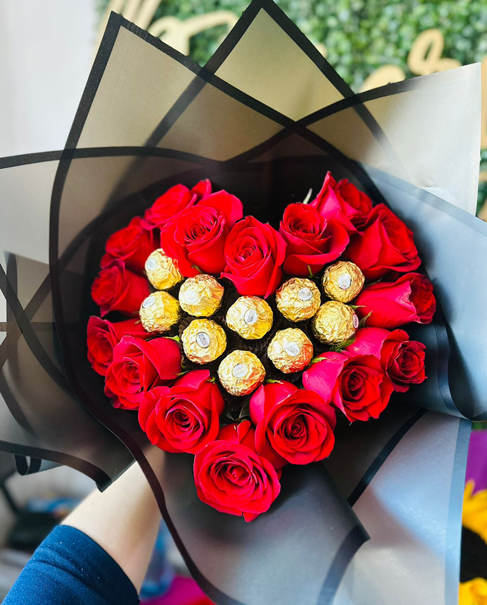 Bouquet con rosas y chocolates Ferrero en el centro envuelto en papel coreano.