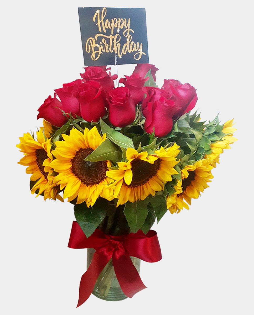 Arreglo floral con12 rosas y 12 girasoles en base de cristal con listón de organza y dedicatoria personalizada.