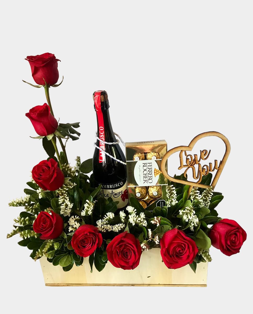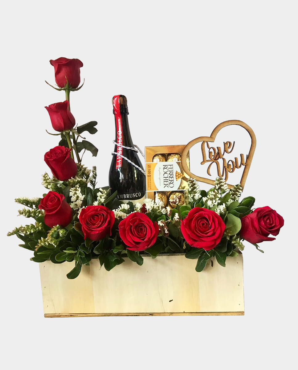 Arreglo floral que incluye una botella Lambrusco de 750ml, una caja de Ferrero Rocher, letrero de madera de Love You, 8 rosas y follajes en caja de madera.