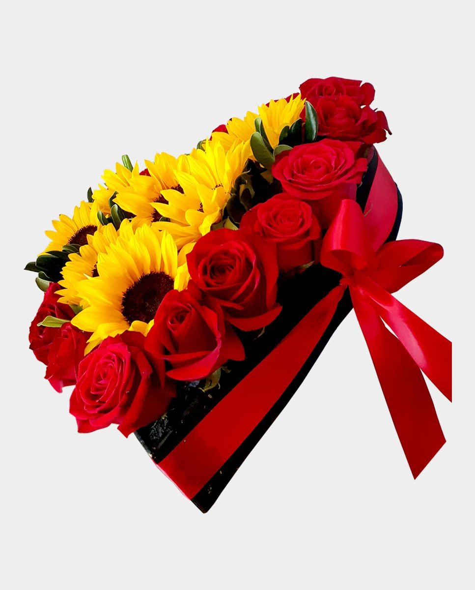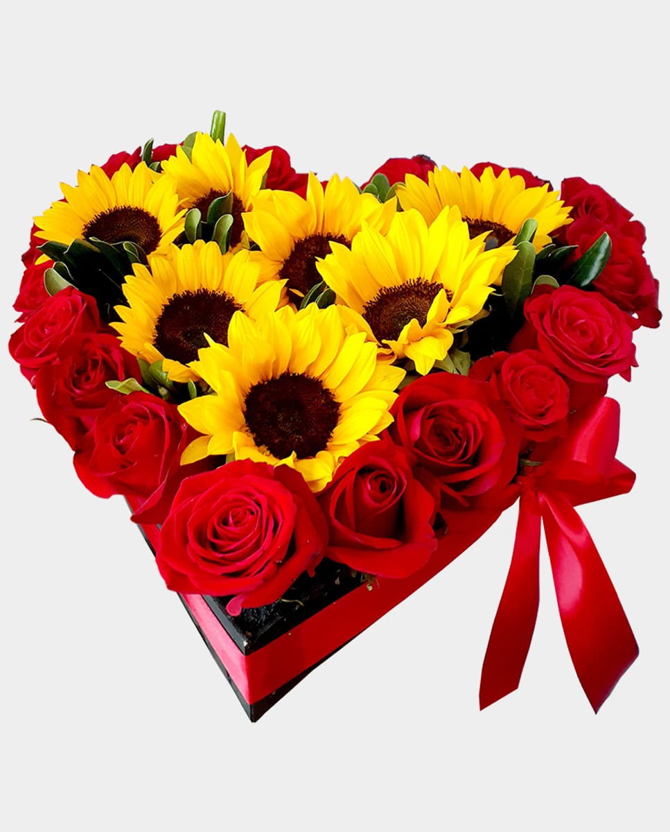 Arreglo de flores con corazón de madera con 20 rosas, 7 girasoles y listón.