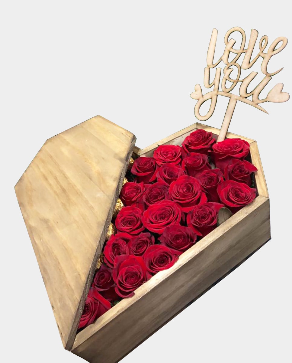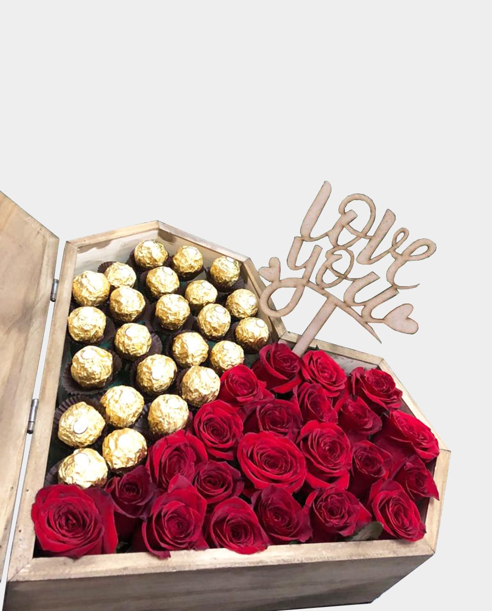 Corazón de madera con tapa de un lado, 24 rosas rojas 24 chocolates Ferrero Roche y con letrero de madera Love You.