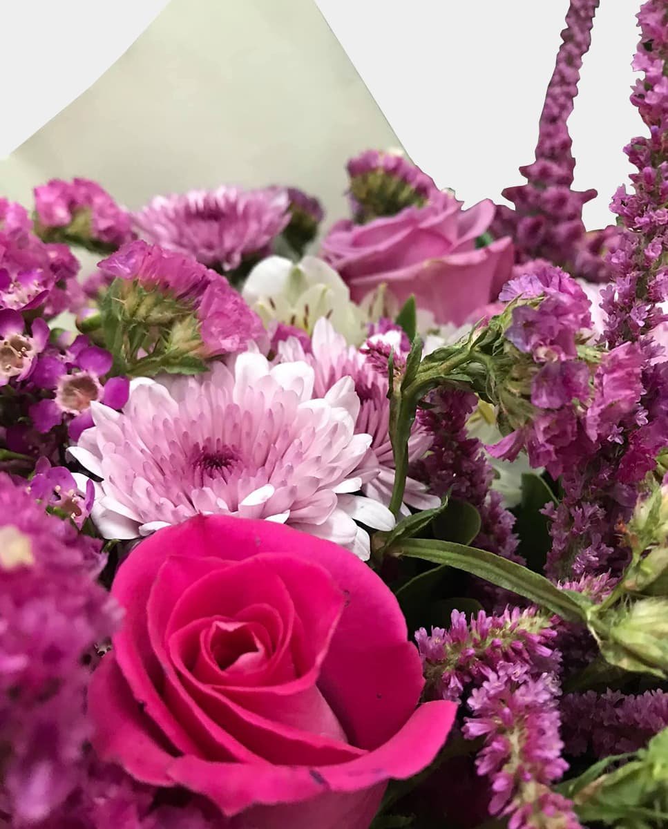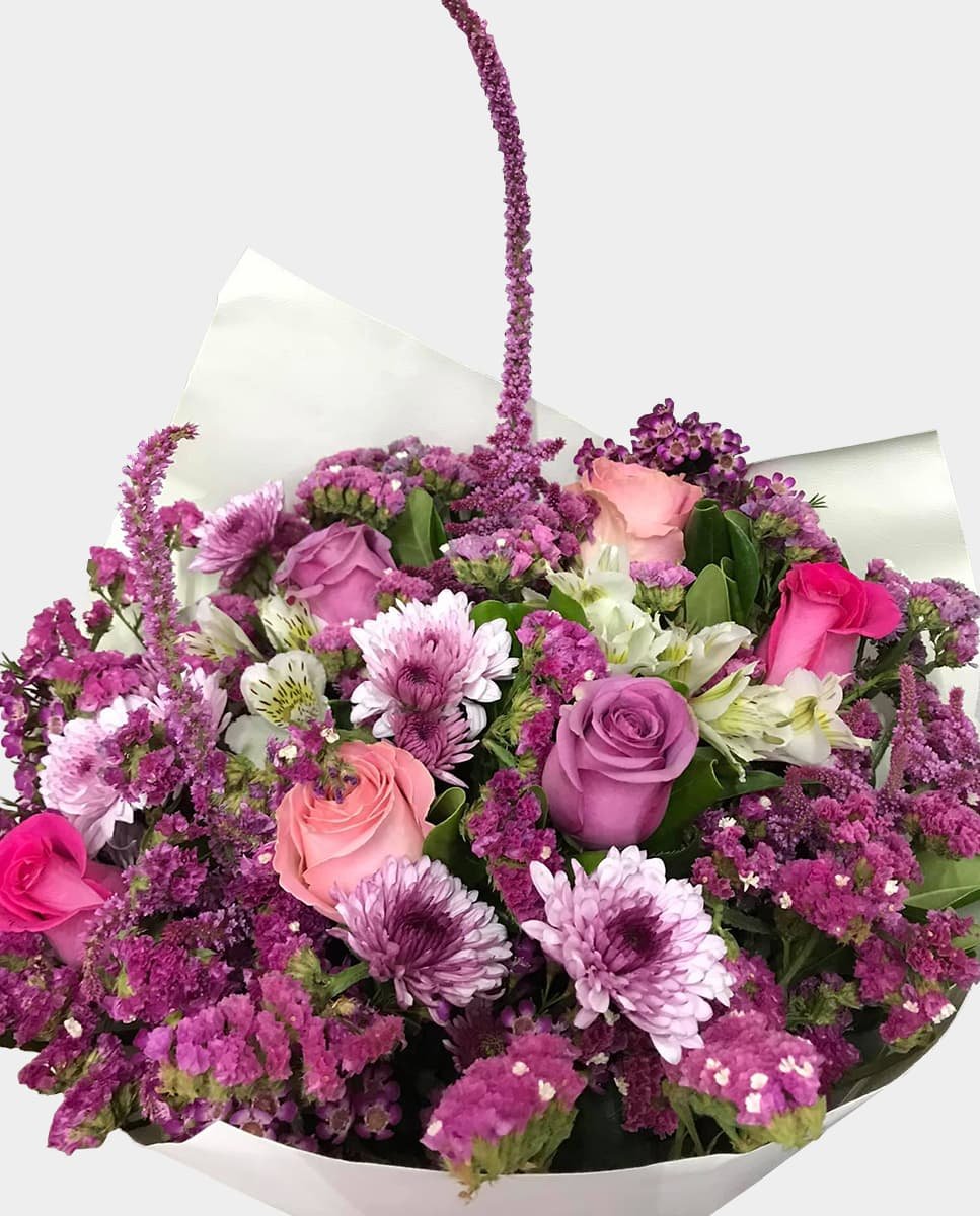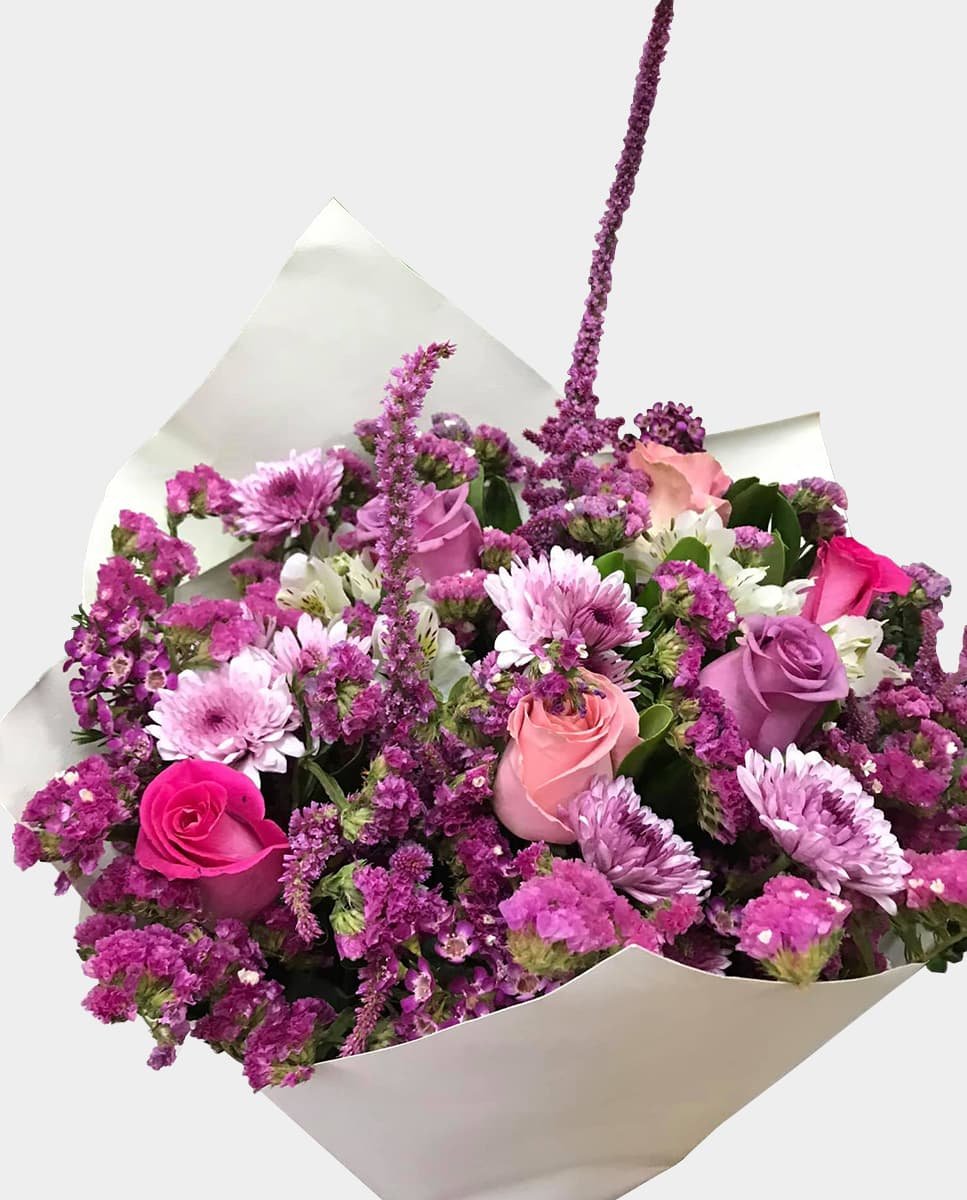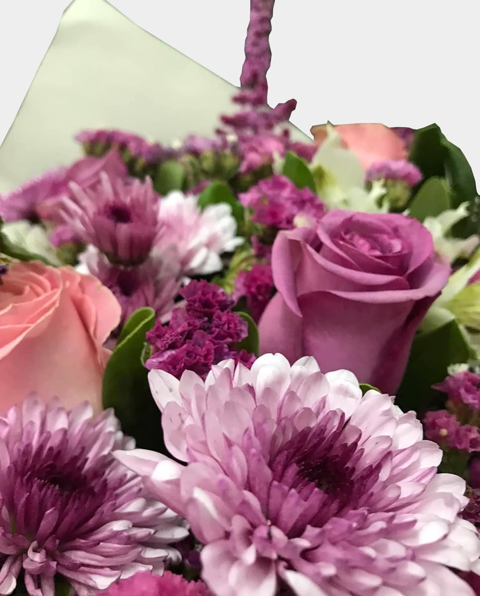 Ramo tipo bouquet combinado con tonos rosas y lilas, variedad de follaje.