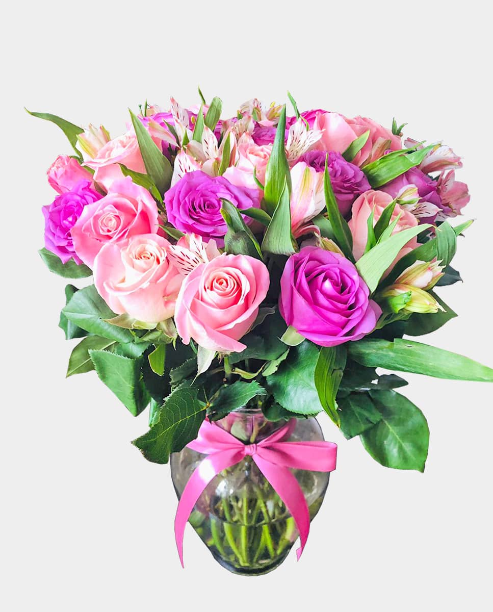 24 rosas tonos pastel con astromelias en jarrón de vidrio.