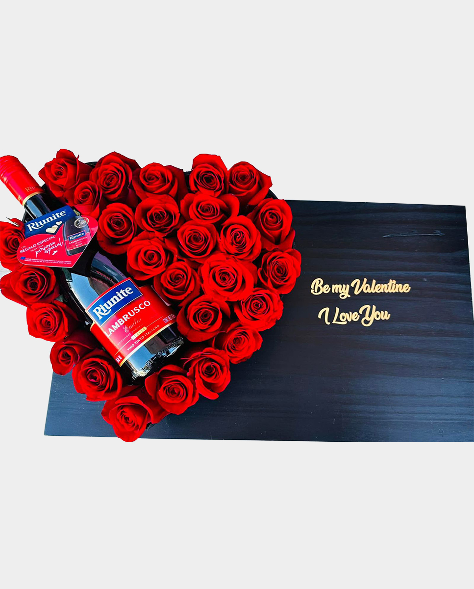 Base de madera con corazón en la esquina Incluye rosas y botella de lambrusco.