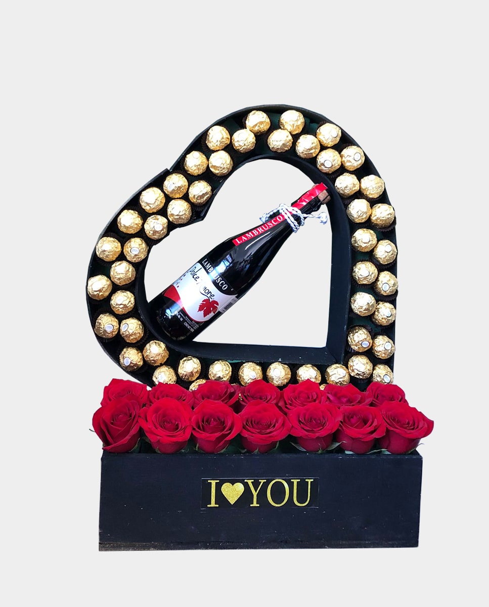 Caja de corazón grande con 55 chocolates Ferrero Roche, 1 botella de vino Lambrusco de 750ml y 14 rosas rojas.