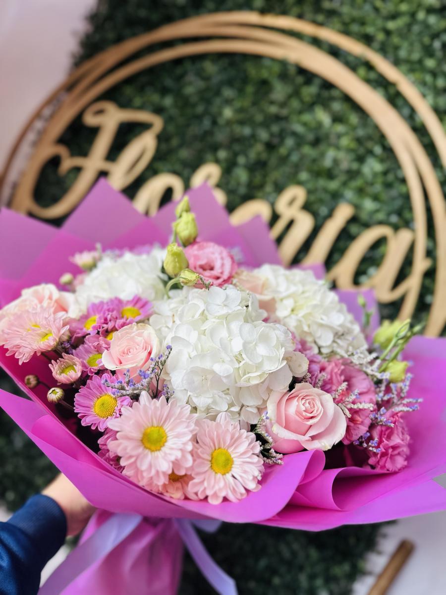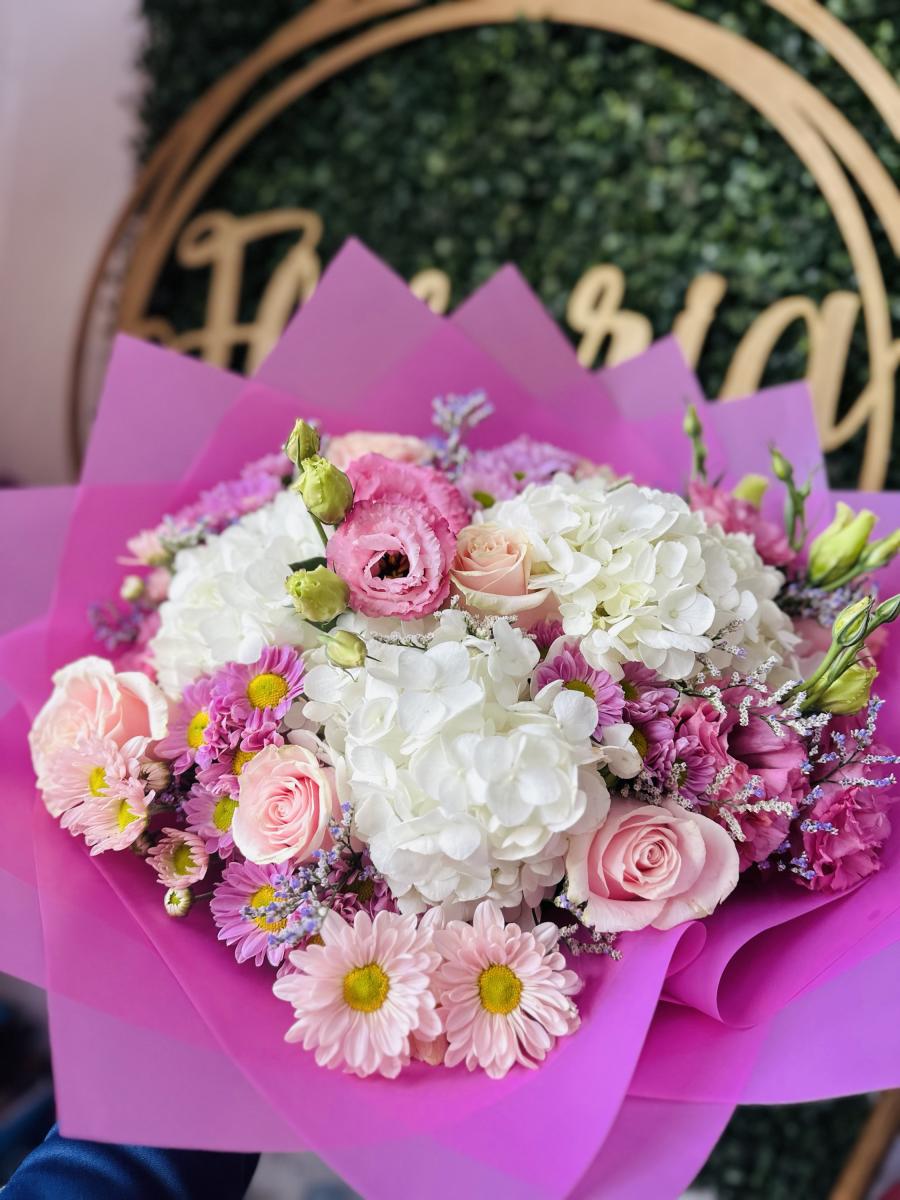 Bouquet con hortensias, lisianthus, rosas y follajes finos.