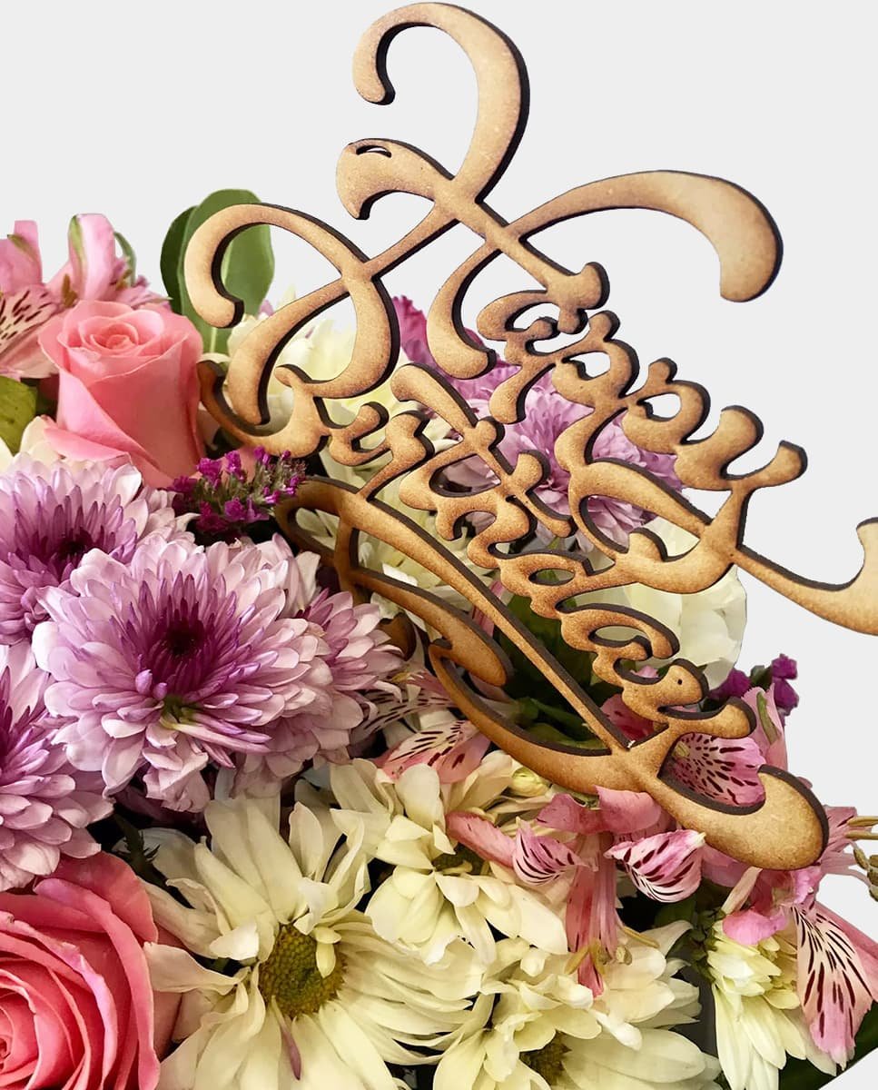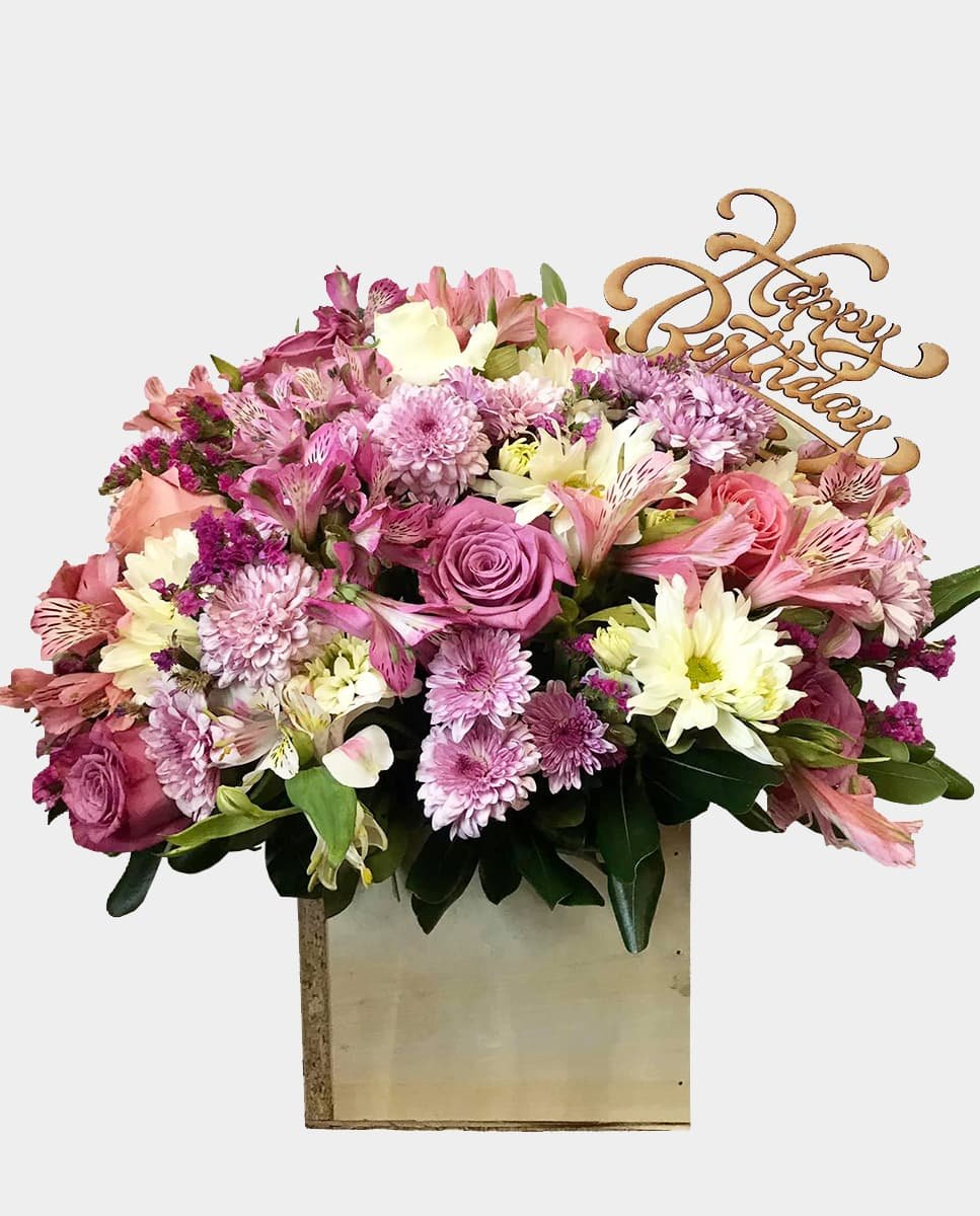 Caja de madera con rosas tonos pastel, variedad de flores y astromelias.