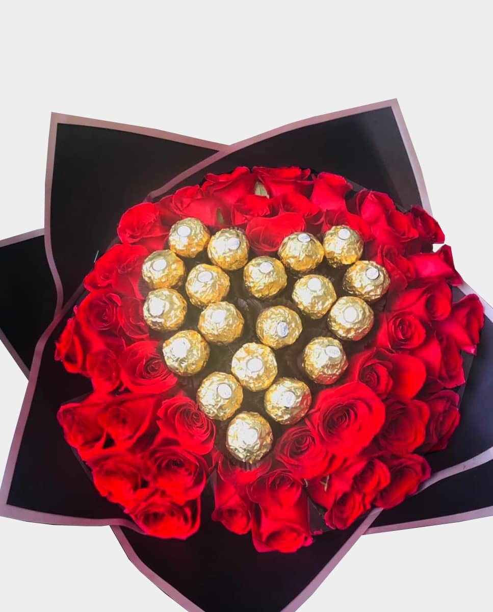 Ramo con 50 rosas rojas y 20 chocolates Ferrero Roche en el centro en forma de corazón, con envoltura de papel coreano color negro.
