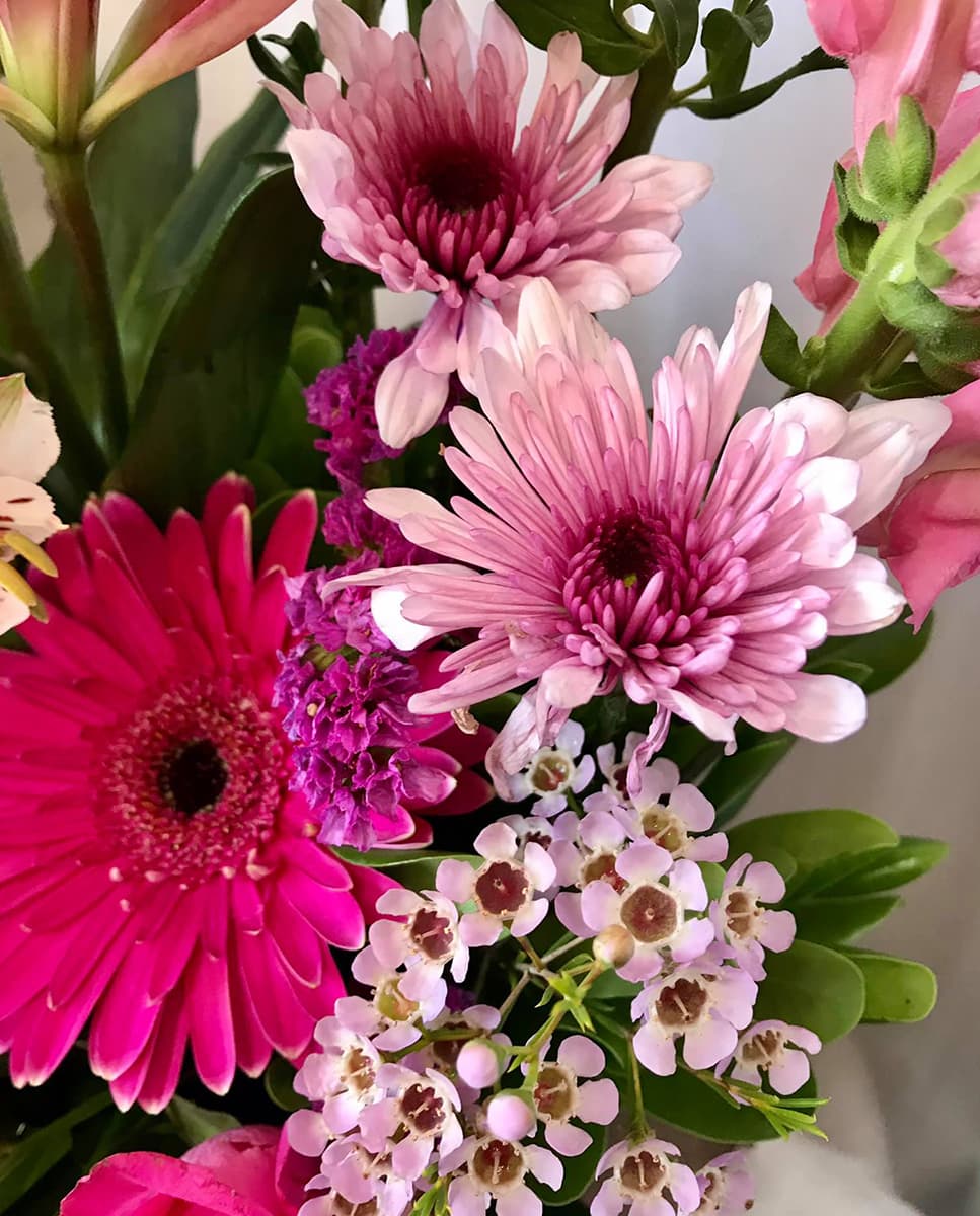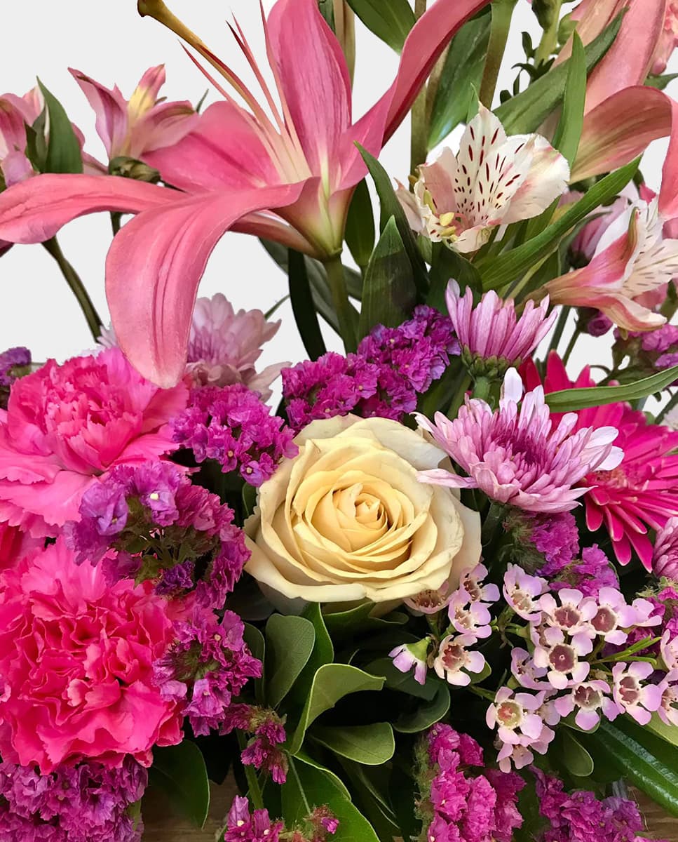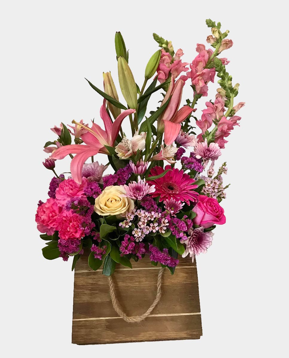 Arreglo en caja de madera tipo bolsa con lili, rosas, gerbera, clavel, perritos, astromelias y distintas florecitas con follaje.