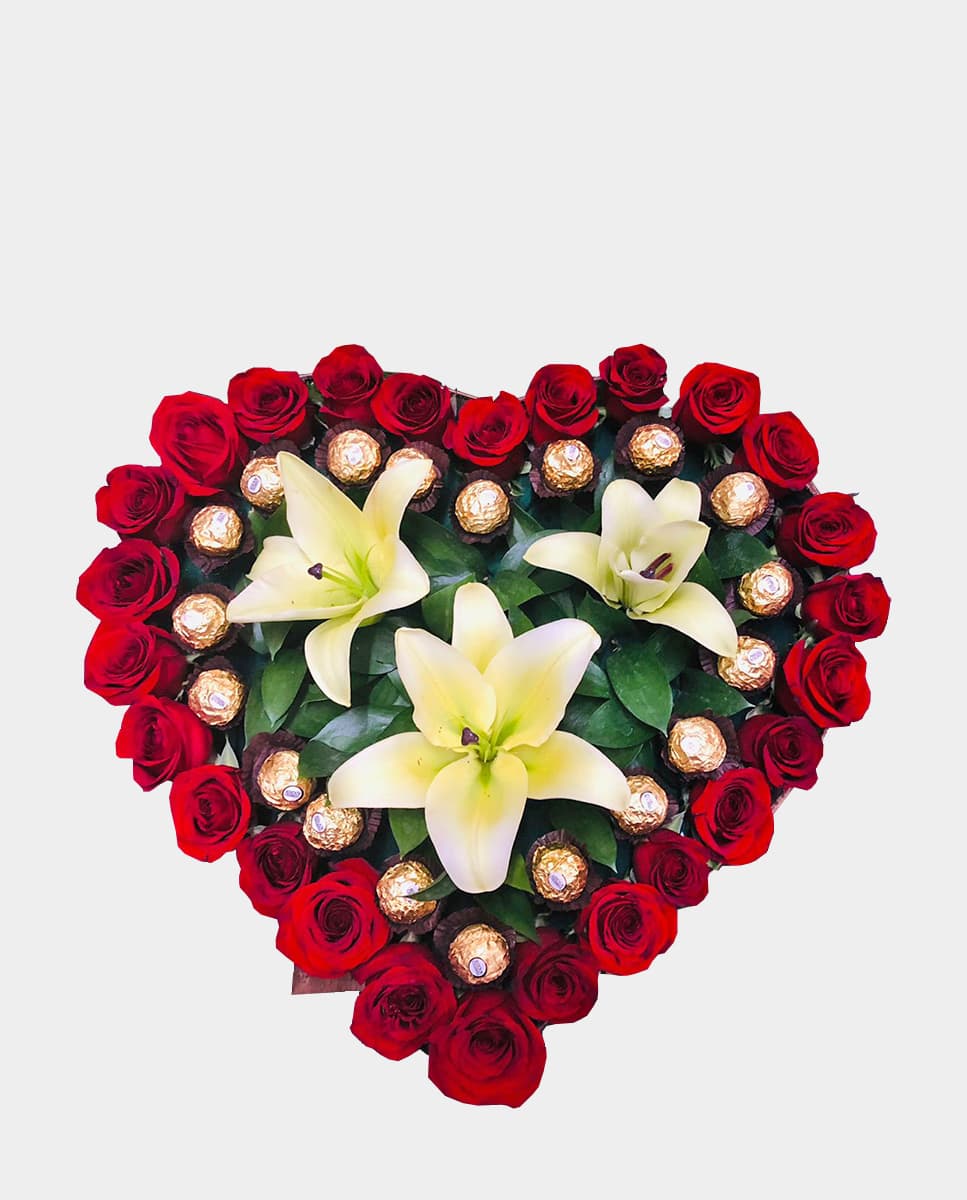 Corazón grande de madera con rosas rojas, chocolates Ferrero Roche, lilis y follaje.