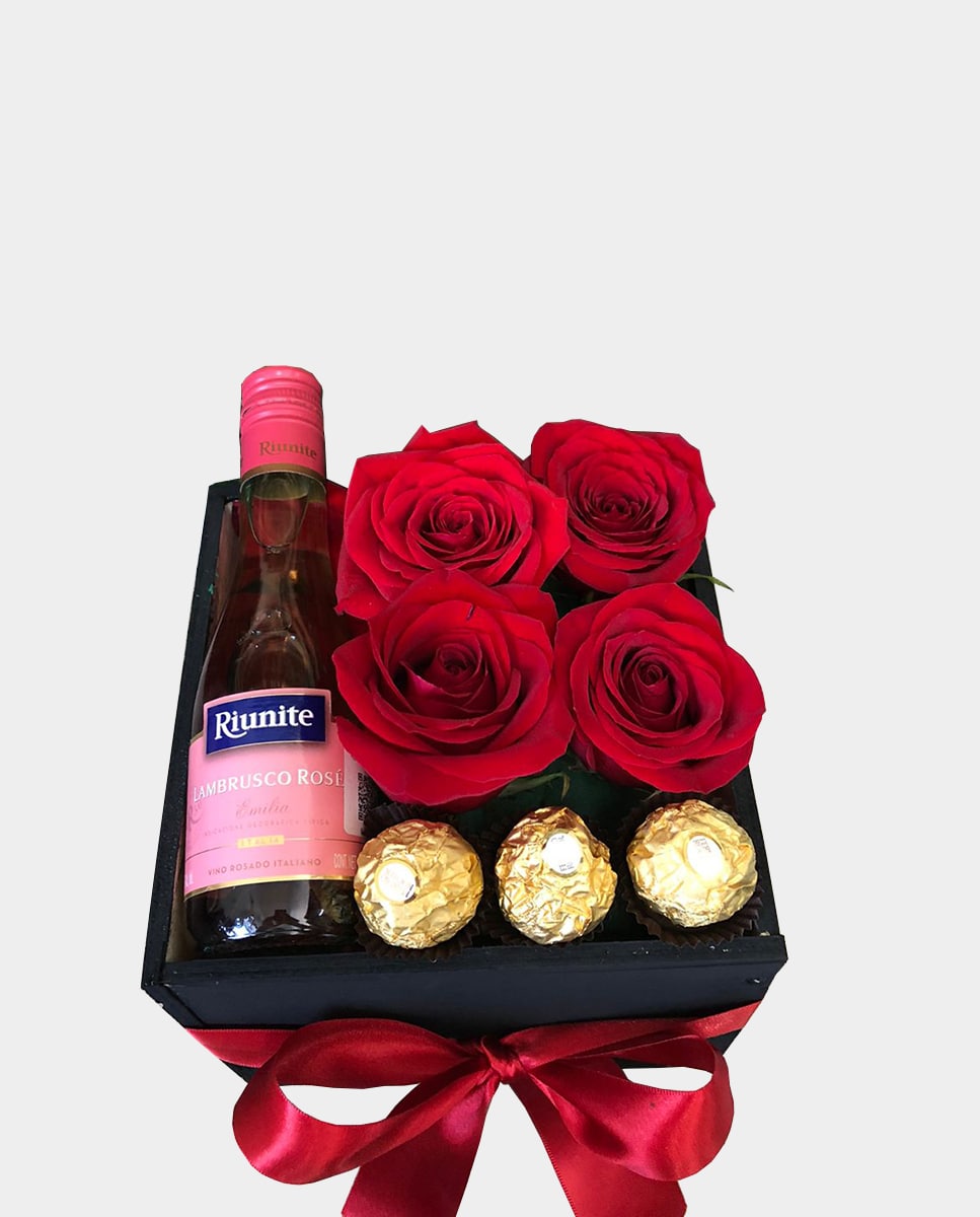 Caja chica de madera con una botella de Lambrusco de 187ml, 3 chocolates Ferrero Roche y 4 rosas rojas.