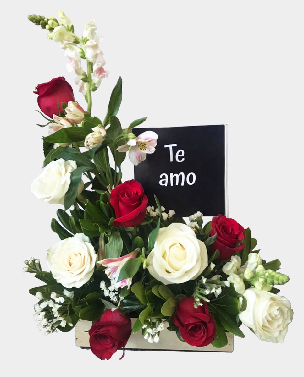 Arreglo floral con 9 rosas, astromelias y follajes finos en canasta de madera